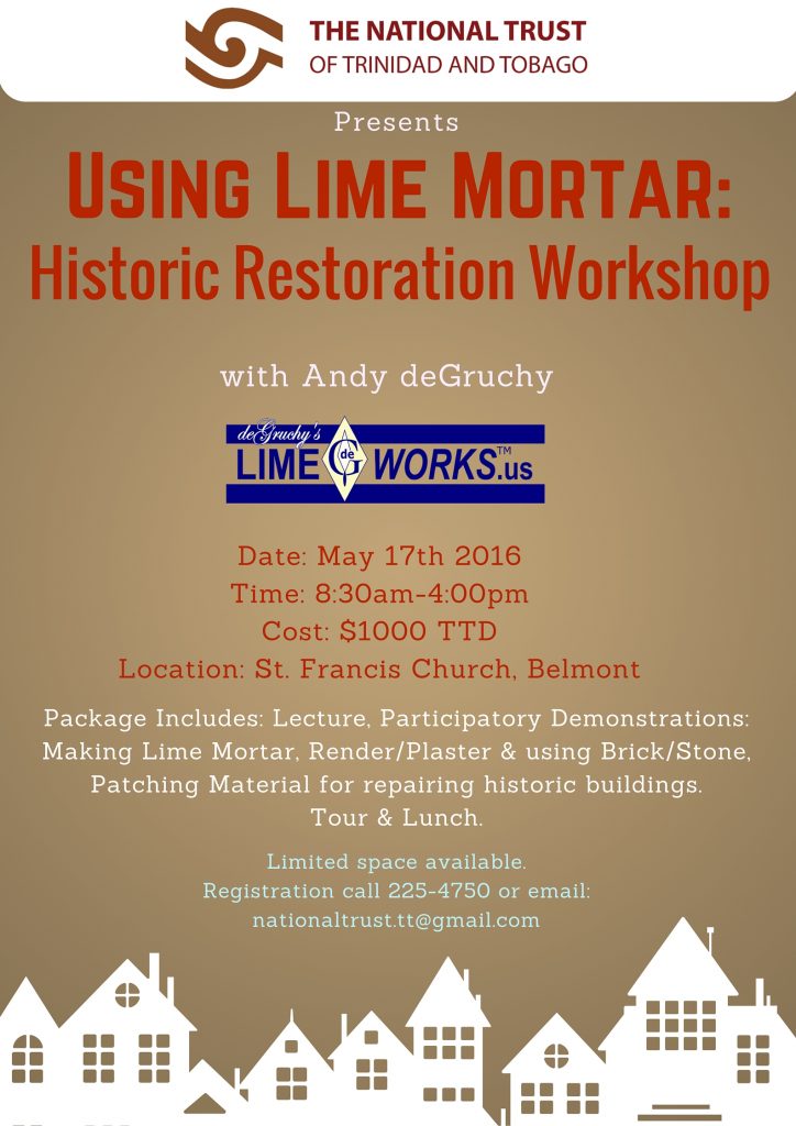 The National Trust of Trinidad and Tobago is hosting a workshop entitled “Using Lime Mortar: Historic Restoration Workshop” on May 17th from 8:30am to 4:00pm on lime in historic buildings and restoration. Andrew L. deGruchy, of LimeWorks USA will lead the programme. This workshop targets architects, engineers, and masons, as well as anyone with historic building built with lime mortar who wish to know more about the material and conduct repairs.