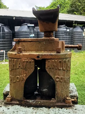 The sugar mill was produced by the Chattanooga Plough Company of Tennessee which was established in 1878. The company produced ploughs and other farming equipment including both animal and mechanical powered mills in a range of sizes. At one point it was the largest factory in Chattanooga and an international leader in plough design and production. The Caribbean was a major market for Chattanooga cane mills, evaporators and furnaces, especially in Jamaica, where or 5000 cane mills were sold.