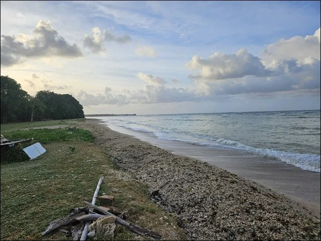 Figure 6 showing the coastline with coral deposits from the fringing coral reef with a glimpse of the Kilgwyn Wetland in the background. Source: Renata C. Ramoutar